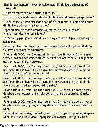 Resultaterne i opgørelsen er fremkommet dels ved en retrospektiv gennemgang af journaler, dels ved en spørgeskemaundersøgelse, hvor alle nulevende patienter fik tilsendt en række spørgsmål angående deres spiseevne (Figur 3 SPAN> ). Desuden blev patienterne bedt om at selvvurdere operationsresultatet ud fra en visuel analogskala bestående af fem delspørgsmål. Herefter er data analyseret ved hjælp af SPSS version 11 for Windows.