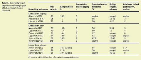 Denne undersøgelse blev gennemført med henblik på at vurdere behandlingsresultatet og patienttilfredshed efter endoskopisk laserbehandling af Zenkers divertikel på vores afdeling. Ved flere sammenlignende udenlandske studier er der fundet væsentlig flere og mere alvorlige komplikationer ved den åbne resektion i form af divertikulotomi eller divertikulopeksi af Zenkers divertikel end ved den endoskopiske resektion (Tabel 1 ). Disse komplikationer er blandt andre beskrevet af Illum & Aggerholm [5] og inkluderer persisterende parese af n. laryngeus recurrens samt purulent mediastinitis, en alvorlig livstruende komplikation, der i værste fald kan kræve torakotomi med kirurgisk sanering af infektionen og høj mortalitet.