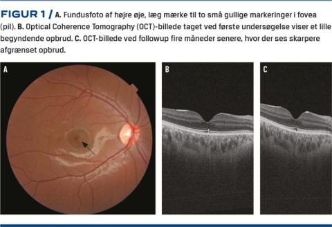 Ved firemåneders kontrol havde drengene ingen synsgener, men objektivt sås der stadig retinal skade med begyndende atrofi. På OCT så man et skarpere opbrud i de samme lag som ved første besøg, men Bruchs membran var fortsat intakt (Figur 1).
