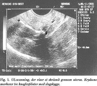 Patienten var 33 år og havde haft to fødsler samt en provokeret og tre spontane aborter i henholdsvis gestationsuge 10, 9 og 15. Ved den seneste abort blev patienten scannet i uge 13, hvor biparietaldiameteren svarede til 13 uger + 6 dage. På grund af formodning om urinvejsmisdannelse blev der aftalt en ny scanning 11 dage senere. Ved kontrolscanningen var fosteret dødt med begyndende sammenfald af caput. Uterus blev tømt med sug nummer 14 og skrabet med en stump curette, der blev ikke anvendt UL-scanning i forbindelse med udskrabningen. Knap fem måneder efter aborten blev kvinden henvist med menorrhagia. Der var samtidig graviditetsønske. Ved UL-scanning blev der set ekkogene strukturer beliggende intrauterint (Fig. 1 ). Ved efterfølgende hysteroskopi fandtes flade, hvidlige elementer med brusk- eller knoglekonsistens. Fem-seks stumper blev fjernet med en spiraltang. I isthmus uteri var der ligeledes et forkalket element, som man opgav at fjerne på grund af perforationsrisiko. Mikroskopien viste knoglesplinter og reaktivt endometrium. Man kunne ikke histologisk afgøre, om der var tale om føtal knogle eller dystrofisk ossifikation. Kvinden konciperede to måneder senere.