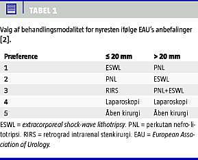 Et generelt princip er, at nyresten altid skal fjernes på den mindst invasive måde. Retningslinjer for valg af behandlingsmodalitet er primært relateret til stenstørrelsen og er angivet i Tabel 1 [2]. ESWL er som udgangspunkt standardbehandlingen af nyresten