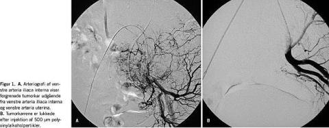 Ved en magnetisk resonans (MR)-skanning blev der fundet en velvaskulariseret tumor i venstre side tæt på arteria iliaca interna og externa. En angiografi viste, at den dominerende karforsyning udgik fra venstre arteria iliaca interna og arteria uterina. For at mindske den peroperative blødning blev der foretaget præoperativt embolisering af hovedstammerne til tumoren (Figur 1).
