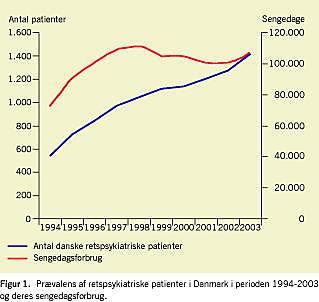Prævalensen pr. år af retspsykiatriske patienter, der er under tilsyn af Kriminalforsorgen, er steget eksponentielt i perioden fra januar 1980 til december 1999 med en estimeret årlig vækstrate på 6,79% [1]. Tilsvarende er der tidligere vist en kraftig stigning i anvendelsen af dom til psykiatrisk særforanstaltning i perioden 1970-1983, hvilket dengang afspejledes i en stigning i forbruget af antallet af sengedage [2]. Stigningen i antallet af de retspsykiatriske patienter skyldes især, at flere patienter med skizofreni begår kriminalitet [1, 3]. I Danmark har stigningen været sammenfaldende med nedlæggelse af psykiatriske sengepladser fra ca. 8.000 i 1978 til ca. 4.000 i 1999 [1]. Der har siden 1987 ikke været stigning i den samlede kriminalitet, hvorfor deinstitutionaliseringen er vurderet at være hovedårsag til væksten i antallet af retspsykiatriske patienter [1].