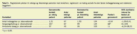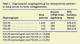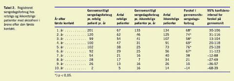 Når de retspsykiatriske patienter med skizofreni sammenlignes med ikkeretslige patienter med skizofreni over en tiårig periode, finder man, at de retspsykiatriske patienter havde et signifikant større gennemsnitligt sengedagsforbrug i de første seks år efter diagnosticering af skizofreni, svarende til mere end 50 ekstra sengedage pr. år pr. patient. Herefter aftager forskellen, og der kan ikke længere påvises nogen forskel (Tabel 2 ).