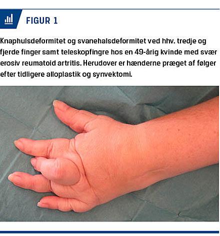 ulnardeviation af fingrene [5]. Svanehalsdeformitet er karakteriseret ved hyperekstension i PIP-leddene samtidig med fleksion i MCP- og distale interfalangeal (DIP)-led. Ved knaphulsdeformitet ses fleksion i PIP-leddet og ekstension i MCP- og DIP-leddene. Her er PIP-leddet lukseret ud mellem ekstensorsenernes to crura, hvilket medfører fleksionskontraktur og samtidig hyperekstension af DIP-leddet [5]. Ved udtalte ledstruktioner, hvor fingerknoglerne forkortes, taler man om teleskopfingre (Figur 1).