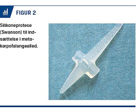 Ved MCP-ledsproblematik, der ikke responderer på konservativ behandling, kan der indsættes en silikoneendoprotese (Figur 2). Et større, prospektivt multicenterstudie viste efter både ét og fem år signifikant forbedret håndfunktion hos patienter, som havde RA og fik silikoneproteser, sammenlignet med en kontrolgruppe [25, 26]. Selvom fraktur af silikonemateriale synes at være relativt almindeligt, påvirker det ikke altid protesefunktionen [27]. Ønsket om bevægelighed har drevet udviklingen af PIP-ledsproteser, idet kravene til proteserne er store pga. PIP-leddenes anatomiske form og mobilitet. Pyrolytisk carbon-proteser i PIP-led giver god smertelindring og funktion i lang tid. Pyrolytisk carbon-hemiartroplastik er et alternativ til en total artroplastik af PIP-leddet og dermed bevares mere knogle end ved artrodeser og revisionsartroplastikker [28].