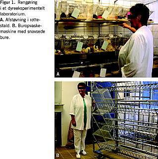 En 59-årig kvinde blev henvist til arbejdsmedicinsk klinik på grund af rinitissymptomer ved rengøring af rottebure. Hun havde arbejdet som rengøringsassistent gennem 32 år, heraf de seneste 15 år i staldene i et dyreeksperimentelt laboratorium. Opgaverne omfattede blandt andet fejning, støvsugning og aftørring af støv i stalde med kaniner, rotter, marsvin og mus (Figur 1A ). Hun brugte ikke støvmaske og handsker ved støvende arbejdsfunktioner. Fire timer dagligt to dage om ugen foretog hun med brug af sæbevand og desinfektionsmiddel manuel afvaskning af ca. 200 rottebure. Rotterne var forinden fjernet af andre personalemedlemmer, og den snavsede strøelse var hældt ud i en skraldespand med lokaludsugning placeret 2-3 meter fra vasken. Ved årsskiftet 2005/2006 fik man en automatisk burvasker, hvori burene skulle placeres med åbningen nedad, de øverste bure over hovedhøjde (Figur 1B ). I løbet af det følgende år fik hun to gange nyseture og tilstoppet næse fulgt af hævelse og rødme over kindbenene. Hudsymptomerne fortog sig efter ca. 14 dage. Første gang husker hun ikke at have lavet noget specielt på arbejdet, anden gang havde hun netop sat beskidte rottebure ind over hovedhøjde i den nye burvasker. Efter anden episode var hun i en periode generet af hoste og åndenød. Hun havde ingen familiær disposition for atopi, havde ikke haft atopiske lidelser i barndommen og havde ingen husdyr, men havde tidligere haft hund. Hun var ryger med et samlet tobaksforbrug på godt otte pakkeår og havde intet medicinforbrug fraset ibuprofen indimellem.