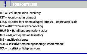 Variationen i prævalensen af depression hos MS-patienter er stor og afhænger af, i hvilken klinisk sammenhæng patienterne indgår. I et canadisk studie fandt man på baggrund af en befolkningsundersøgelse, der var baseret på 115.071 personer, som blev screenet med The Composite International Diagnostic Interview Short Form for Major Depression, at 25,9% af de 18-45-årige MS-patienter havde depression, hvilket var en fordobling i forhold til baggrundsbefolkningen [1]. Chavastiak et al [2] undersøgte medlemmer af MS-patientforeningen i Kings County, Washington State, USA med et spørgeskema. De fandt, at 41% af patienterne havde depression vurderet med Center for Epidemiological Studies - Depression Scale (CES-D) > 16. I alt 29% havde moderat til svær depression, CES-D > 21. I en ny dansk undersøgelse [3] fandt man, at patienter, der var diagnosticeret med MS, havde en 4,75 gange så stor sandsynlighed for at få udskrevet antidepressiv medicin end en alders- og køns- og kalendermatchet kontrolgruppe fra baggrundsbefolkningen. Der er således stor forskel på prævalensen af depression afhængigt af, i hvilken klinisk sammenhæng og med hvilket redskab prævalensen er vurderet.