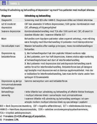 Summary Risk of affective disorder in multiple sclerosis Ugeskr Læger 2011;173(2):123-126 An increased risk for depression has been found in multiple sclerosis (MS). The purpose of the present study has been to give suggestions to guidelines for diagnosis and treatment of depression in MS in Denmark based on the international literature and recommendations. The method was a review of the relevant literature. The study recommends assessment of all MS patients for depression. Treatment of depression with serotonin reuptake inhibitors and/or cognitive behavioural therapy is recommended, depending on the severity of the illness. Caution is recommended in patients receiving beta interferon treatment.
