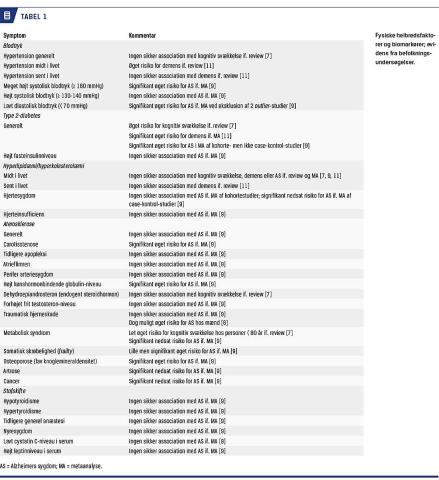 Hypertension midt i livet er associeret med signifikant øget risiko for senere udvikling af demens (Tabel 1) [11]. Der ses en lille, men signifikant øget risiko for demens ved et systolisk blodtryk ≥ 160 mmHg, men ikke ved et systolisk blodtryk i intervallet ≥ 130-140 mmHg [9]. Betydningen af hypertension sent i livet er kompliceret, men ifølge nyere studier er hypertension hos 75+-årige associeret med bedre kognitiv funktion [14] og mindsket demensrisiko [11]. Lavt diastolisk blodtryk (< 70 mmHg) er knyttet til en signifikant øget risiko for at få demens [9].