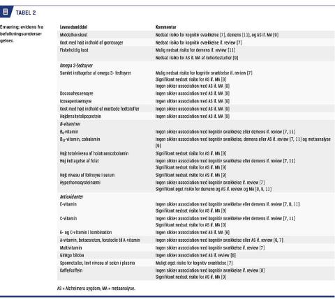 Fiskeholdig kost og såkaldt middelhavskost, der ud over fisk indeholder grøntsager, kornprodukter, bælgfrugter, planteolier mv., er associeret med nedsat risiko for kognitiv svækkelse og demens (Tabel 2) [6, 7, 9, 11]. Indtagelse af omega 3-flerumættede fedtsyrer er muligvis associeret med nedsat risiko for kognitiv svækkelse [7], men to metaanalyser vedrørende demensrisiko viser modstridende resultater [8, 9]. Heller ikke specifikke omega 3-fedtsyrer som icosapentaen- og