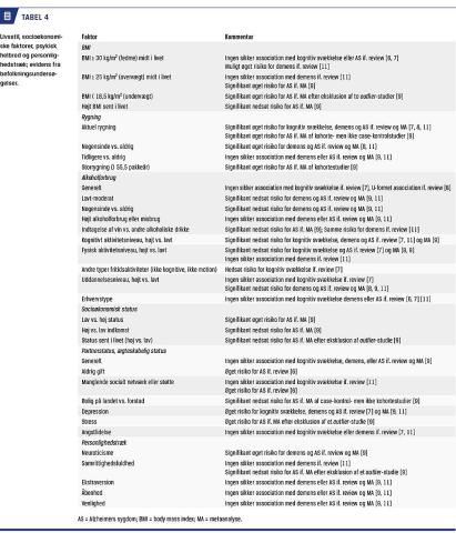 Epidemiologisk forskning udmærker sig ved ofte lang opfølgningstid, men rummer velkendte metodeproblemer i form af deltagerfrafald, recall-bias, utilstrækkelig statistik kontrol for konfoundere mv. Epidemiologisk forskning i risikofaktorer for kognitiv svækkelse og demens er sammenfattet i en række evidensrapporter, systematiske review og metaanalyser fra perioden 2010-2015 [6-11]. Formålet med denne artikel er at resumere de væsentligste fund vedrørende modificer bare risikofaktorer hos midaldrende og ældre. »Kognitiv svækkelse« refererer her til et kontinuum af ændringer fra normale aldersforandringer til mild cognitive impairment (MCI) [12]. Som det fremgår af Tabel 1, Tabel 2, Tabel 3 og Tabel 4, fokuserer man i flertallet af metaanalyserne på risikoen for at udvikle Alzheimers sygdom. Da personer med Alzheimers sygdom per definition har demens, anvendes betegnelsen demens i den følgende tekst om både Alzheimers sygdom og andre demenssygdomme. Den seneste danske oversigtsartikel om emnet er fra 2006 [13].