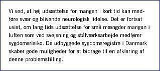 Vi ved, at kraftig udsættelse for manganholdigt støv kan medføre ekstrapyramidal lidelse efter få måneder, men det er fortsat uafklaret, om længere tids udsættelse for mangan ved lave eksponeringsniveauer som ved nutidigt svejse- og stålværksarbejde indebærer en sygdomsrisiko. De få foreliggende epidemiologiske undersøgelser er hver for sig og samlet inkonklusive. Man vil kunne komme en afklaring væsentligt nærmere ved registerstudier af eksisterende store danske kohorter af metalarbejdere med pålidelige oplysninger om svejseeksposition. Med det rette design vil det også kunne belyses, om mangan kan medføre tidligere debut af Parkinsons sygdom og anden neurodegenerativ sygdom.