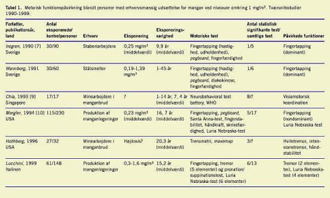 De seneste 15 år er der i Vesteuropa og Nordamerika foretaget seks kontrollerede tværsnitsundersøgelser af motoriske funk- tioner hos arbejdere med erhvervsmæssig udsættelse for mangan (Tabel 1 ). Eksponeringen er typisk dokumenteret ved måling af mangan i luften, oftest omkring 1 mg/m3 , altså en forholdsvis lav luftbåren eksponering. De motoriske funktioner er vurderet ved en række test: Finger tapping (hastighed og udholdenhed), behændighed og fingerfærdighed (pegboard dexterity test , Santa Anna-test), håndstabilitet, diadokokinese, tegne- og skrivefærdighed (bl.a. parallellinjetegning), com- puteriseret vurdering af tremor og pronation/suppination (CATSYS, DPD, Snekkersten) og sammensatte motoriske funktionstest (Luria Nebraska testbatteri, 51 elementer). I hvert studie har man typisk anvendt 5-17 forskellige test, og man har kun i begrænset omfang anvendt de samme tests i de forskellige studier. Man har vurderet finger tapping i fem studier for henholdsvis dominant og ikkedominant hånd og fandt i tre af ti analyser statistisk signifikant nedsat hastighed blandt de manganeksponerede. Fingerfærdighed eller behændighed har man fundet statistik signifikant påvirket i to af seks analyser. Ud over motoriske funktioner vurderede man også i flere af studierne kognitive funktioner såsom koncentration, opmærksomhed og hukommelse og sensoriske funktioner. I en nyere undersøgelse, som har vakt betydelig offentlig opmærksomhed, fandt Racette en lavere debutalder blandt svejsere med Parkinsons sygdom end blandt andre Parkinson- patienter (46 vs. 63 år) [4]. Dette er dog ganske forventeligt, når man sammenligner erhvervsaktive patienter med en uselekteret gruppe patienter, der har en sygdom med relativ høj debutalder [5]. Fundet bidrager derfor næppe til vores for- ståelse af miljøfaktorers betydning for Parkinsons sygdom.