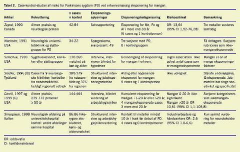 Ved en stort anlagt populationsbaseret undersøgelse af årsager til Parkinsons sygdom blev 144 Parkinson-cases og 464 alders-, køns- og racematchede kontrolpersoner blandt omkring 240.000 personer over 50 år identificeret i almen praksis [6]. Ved interview indhentede man oplysninger om arbejdsforhold, som blev vurderet blindt af en arbejdshygiejniker. Eksponeringsprævalensen af mangan var yderst lav, og den relative risiko for Parkinsons sygdom på over ti er baseret på få tilfælde. En række hospitalsbaserede case-kontrol under- søgelser er karakteriseret ved usikker eksponeringsdokumentation og er derfor heller ikke konklusive (Tabel 2 ).
