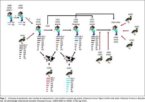 Influenzavirus kan ændre sit genetiske materiale på flere måder. Forskellige subtyper kan udveksle genetisk materiale. Dette skete i forbindelse med pandemierne i 1957 og 1968 (Figur 1). Det fremgår, at svin ofte fungerer som mellemvært i forbindelse med overførsel af gener fra aviær influenzavirus, da de er modtagelige for såvel aviære som humane A-influenzavirus. Ved samtidig infektion kan der udveksles genetisk materiale mellem de to virus (antigenskift), og et nyt virus med pandemisk potentiale kan opstå. Herudover har influenzavirus som andre RNA-virus en høj mutationsrate. Ophobninger af mutationer resulterer i små ændringer i anti-geniciteten af HA og NA (antigendrift). Sammen med en relativ kortvarig immunitet er antigendrift årsag til mindre epidemier, hvilket nødvendiggør fremstilling af en ny vaccine hvert år. Vaccinen baseres således på den senest udbredte variant af influenzavirus. I denne vinter blev der fundet en ny H3N2-variant (A/Fujian-like ), som medførte flere sygdomstilfælde og en mindre beskyttelse ved brug af vaccinen end ønsket.