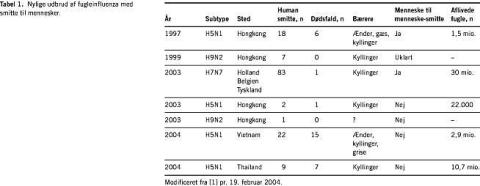 I 1997 medførte et udbrud af AI (H5N1) blandt fjerkræ, at seks af 18 inficerede mennesker døde. De serologiske undersøgelser påviste, at der havde været en begrænset smitte fra menneske til menneske [4]. Der er almindelig enighed om, at en pandemi dengang blev forhindret på grund af den hurtige indgriben, hvor de inficerede fjerkræbesætninger blev slået ned i løbet af få dage (Tabel 1 ). I februar 2003, under SARS-epidemien, blev H5N1 dog igen påvist i Hongkong hos to patienter, som formodes at være smittet fra fjerkræ under besøg i det sydlige Kina; én af patienterne døde, og der opstod ikke sekundære tilfælde. I foråret 2003 var der et udbrud med en anden HPAI-subtype H7N7 blandt fjerkræ i Holland, Belgien og Tyskland. I Holland blev dette virus desuden isoleret fra 89 personer, hvoraf én døde. Flertallet af patienterne havde konjunktivit, og kun få havde egentlige influenzasymptomer. I tre tilfælde skete der smitte fra menneske til menneske. De fleste virusisolater fra patienter havde ikke signifikante mutationer. Imidlertid fandtes virus i den afdøde patient at have undergået væsentlige ændringer (antigendrift) med 14 aminosyresubstitutioner, hvoraf nogle kunne relateres til det alvorlige forløb [5].