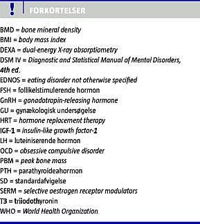 Formålet med denne artikel er at redegøre for og diskutere de kliniske og patofysiologiske aspekter af den kvindelige idrætstriade med særlig henblik på screening og behandling. Spiseforstyrrelser er rapporteret blandt 1-78% af kvindelige atleter [2]. Den store variation i prævalensen skyldes først og fremmest forskellige screeningsprocedurer, forskelle i de diagnostiske kriterier af spiseforstyrrelserne og, at der er undersøgt grupper, som er forskellige mht. idrætstype -og træningsintensitet. Der findes ingen større epidemiologiske studier af problemets omfang i Danmark. I et norsk kontrolleret studie [3], hvor 1.259 eliteatleter blev inkluderet (572 kvinder og 687 mænd, der repræsenterede 68 forskellige idrætsgrene), fandt man en prævalens af spiseforstyrrelser hos kvindelige atleter på 20% sammenlignet med 9% hos kontrolgruppen. Spiseforstyrrelser var hyppigere forekommende i idrætsgrene, hvor lav kropsvægt prioriteres, samt blandt kvindelige atleter end hos mandlige atleter (8%) [3].
