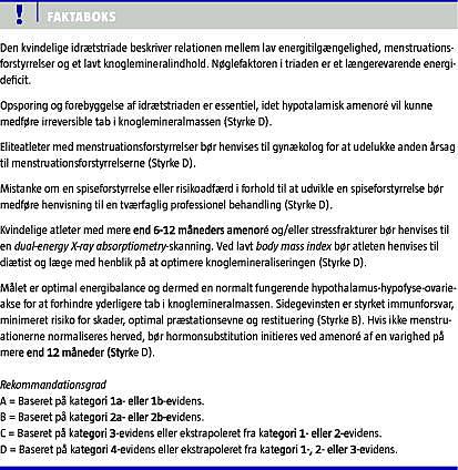 Den gunstige effekt af optimeret kostindtagelse hos eliteatleter er kun påvist i relativt små studier, og der mangler evidensbaserede rekommandationer for hormonsubstitutionsbehandlingen. Flere randomiserede undersøgelser af kvindelige eliteatleter, der vil kunne belyse idrætstriaden og give et mere realistisk billede af prævalensen hos elitens piger og kvinder, anbefales.