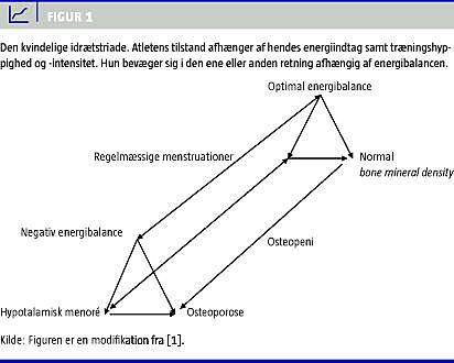 Motion giver et sundt helbred og forbedret livskvalitet, men intens træning under længerevarende lav energitilgængelighed kan medføre patologiske tilstande. Idrætstriaden udgøres af et patofysiologisk samspil mellem lav energitilgængelighed (med eller uden spiseforstyrrelse), menstruationsforstyrrelser og lav knoglemineraltæthed (BMD). Lav energitilgængelighed er et forholdsvis nyt begreb inden for idrættens verden, hvor man tidligere har anvendt kronisk negativ energibalance og energideficit. Kvinders deltagelse i eliteidræt er stigende, og den kvindelige idrætstriade, (som er den gængse danske oversættelse af the female athlete triad ) konstateres med stigende hyppighed blandt kvindelige atleter. Idrætstriaden er beskrevet første gang i 1992 af American College of Sports Medicine [1, 2].