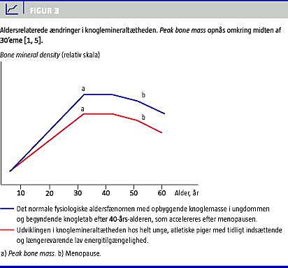 Osteoporose er en degenerativ lidelse i knoglerne og ikke kun et spørgsmål om accelereret progressivt knogletab, men kan også skyldes manglende opbygning i ungdommen. Knoglemineralindholdet opbygges indtil midt i 30'erne, hvor et maksimum i knoglemassen peak bone mass (PBM) nås, hvorefter et aldersrelateret fald efter 40-års-alderen indtræder. Dette fald i BMD accelereres efter menopausen ved ophør af ovariernes østrogenproduktion (Figur 3 ). Fysisk aktivitet med high-impact og vægtbelastning af skelettet (f.eks. løb, gang, hop, dans) stimulerer dannelsen af hormoner, som fremskynder knogledannelsen. Fysisk aktivitet samt høj calciumindtagelse i børne- og ungdomsårene øger PBM. Et højt PBM nedsætter risikoen for frakturer senere i livet [1, 5]. Helt unge elitepiger med længerevarende lav energitilgængelighed og intens træning er i stor risiko for senere menarche, primær amenoré, og for ikke at opnå et tilstrækkeligt PBM og vil derfor ligge lavere i deres knoglemineralmasse med øgede risici for osteoporose og stressfrakturer (Figur 3) [1, 5].