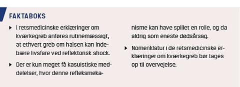 I danske retsmedicinske erklæringer, herunder erklæringer fra Retslægerådet, har man ved vurderingen af farligheden af greb om halsen traditionelt anvendt en bestemt nomenklatur. Når der i forbindelse med halsgreb findes punktformede blødninger i øjnenes bindehinder, øjenlågene, ansigtshuden i øvrigt, bag ørene og i mundslimhinden, anføres det, at halsgrebet har været kraftigt og dermed manifest livsfarligt. Hvis der imidlertid ikke er punktformede blødninger, nævnes det rutinemæssigt, at »den anvendte vold har været beskeden og derfor næppe manifest livsfarlig«, hvorefter det tilføjes, »at ethvert greb om halsen eller enhver form for vold mod halsens for- eller sideflader kan indebære livsfare ved shock udløst fra strubehovedet og/eller halskarrene«. Den sidste sætning henviser til faren for asystoli som følge af vasovagal refleks, som i retsmedicinske lærebøger angives at kunne forårsage pludselig død i forbindelse med endog ganske let vold mod halsen. Forfatteren har spurgt kollegaer i flere andre lande (Sverige, Tyskland, Schweiz og England) og fået oplyst, at de ikke rutinemæssigt anvender en tilsvarende nomenklatur, hvad angår faren for hjertestop udløst af en refleksmekanisme, og der hersker ingen international enighed blandt retsmedicinere [1].