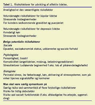 Summary Risk factors for development of affective disorders Ugeskr Læger 2007;169(16):1434-1436 There is consensus that genetic factors are the most important risk factor for both bipolar and unipolar disorders. Concerning other risk factors there seems to be complex interactions between biological, psychological and sociological factors. For bipolar disorder, suggestive findings have been provided concerning pregnancy and stressful life events and female gender and stressful life events are the most reliable factors for unipolar disorder. Clinical and research recommendations are given in order to create strategies for the prevention of affective disorders.