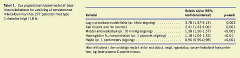 Gennem opfølgningstiden steg urinalbuminudskillelsen hos de patienter, hos hvem der udvikledes mikroalbuminuri. Hæmoglobin A1c var signifikant højere i gruppen af patienter, hos hvem der udvikledes mikroalbuminuri (9,1% over for 8,4%, p< 0,001). I denne gruppe var der også flere patienter med alvorlige øjenforandringer, og flere patienter, der påbegyndte antihypertensiv behandling (62% over for 14%, p< 0,001). Signifikante prædiktorer ved baseline (kort tid efter debut af diabetes) for udvikling af persisterende mikroalbu-minuri var urinalbuminudskillelse, at være mand, middel arterieblodtryk, hæmoglobin A1c , og højde (Tabel 1 ).
