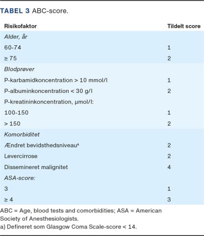 I et nyligt publiceret studie har Laursen et al [11] påvist, at det med et scoringssystem er muligt at prædiktere risikoen for død inden for 30 dage blandt både patienter med ØGIB og patienter med nedre gastrointestinal blødning (Tabel 3). Age, blood tests and comorbidities (ABC)-score blev udviklet ud fra en international prospektiv kohorte af patienter med ØGIB (n = 3.012) og efterfølgende valideret i en international kohorte af patienter med ØGIB (n = 4.019) samt en kohorte af patienter med nedre gastrointestinal blødning (n = 2.336). Man fandt, at ABC-score med tilfredsstillende præcision kunne anvendes til prædiktion af 30-dagesdødelighed hos såvel patienter med ØGIB (AUROC: 0,81) som patienter med nedre gastrointestinal blødning (AUROC: 0,84). Ved hjælp af ABC-score kan man opdele ØGIB-patienter i lav (ABC-score ≤ 3; 40%), mellem (ABC-score 4-7; 45%) og høj (ABC-score ≥ 8; 15%) risiko med 30-dagesmortalitetsrater på hhv. 1%, 7% og 25%. Eksisterende data tyder på, at ABC-score er bedre til prædiktion af død end de øvrige scoringssystemer inden for øvre (AIMS65, Rockall-score, Progetto Nazionale Emorragia Digestiva (PNED)) samt nedre gastrointestinal blødning (Oakland, Strate, ongoing bleeding, low systolic blood pressure, elevated prothrombin time, erratic mental status, unstable comorbid disease (BLEED), non-steroidal anti-inflammatory drug use, no diarrhea, no abdominal tenderness, blood pressure ≤ 100 mmHg, antiplatelet drug use, albumin < 3.0 g/dL, disease score ≥ 2, and syncope (NOBLADS), AIMS65, GBS og Rockall-score) [11, 19].