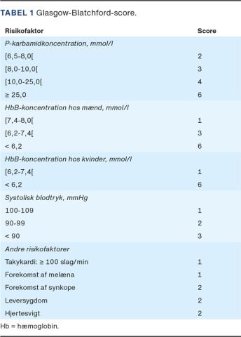 I 2000 publicerede Blatchford et al et skotsk multicenterstudie (n = 1.748), hvor de identificerede risikofaktorer, der var associeret med behov for hospitalsbaseret intervention hos patienter med symptomer på ØGIB. Hospitalsbaseret intervention defineredes som behov for blodtransfusion, hæmostatisk intervention (endoskopisk, kirurgisk eller radiologisk) eller død. De identificerede risikofaktorer dannede grundlag for Glasgow-Blatchford-score (GBS) (Tabel 1). I 2009 påviste Stanley et al i et multicenterstudie (n = 676) fra Storbritannien, at man med GBS langt bedre kunne prædiktere behov for hospitalsbaseret intervention eller død end med det tidligere publicerede scoringssystem kaldet Rockall-score [12]. Man fandt samtidig, at patienter med en GBS på 0 havde en meget lav risiko for behov for intervention eller død, hvorfor dette studie som det første lagde op til ambulant udredning af patienter med en GBS på 0. Efterfølgende har resultaterne af en række studier, herunder et stort internationalt multicenterstudie med dansk deltagelse (n = 3.012) [17], bekræftet, at GBS er det bedste scoringssystem til identifikation af patienter med behov for blødningsrelateret hospitalsindlæggelse, og at patienter med en GBS på 0 har en meget lav risiko for et alvorligt forløb og efter klinisk vurdering kan behandles sikkert i ambulant regi. Den prædiktive styrke af GBS udtrykt ved arealet under en reciever operating characteristics-kurve (AUROC) ligger tilfredsstillende højt på 0,86-0,90 [12, 17]. Blandt patienter med en GBS ≤ 1 fik 1,8% blodtransfusion, 1,4% fik endoskopisk behandling, 0,4% havde behov for embolisering eller operation og 0,4% døde inden for 30 dage [17].