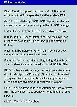 Hvorfor nu al den opmærksomhed? Svaret er todelt: 1) Opdagelsen af RNAi kaster helt nyt lys på vores genom og udvikling af genetiske sygdomme. Rækken af genetiske sygdomme, der skyldes fejl i proteinkodende gener, er som bekendt meget lang, og for mange sygdomme er de molekylærgenetiske årsager nøje beskrevet. Er det muligt, at genetiske sygdomme kan skyldes geners fejlregulering som følge af fejl i RNAi-maskineriet, eller at RNAi-processer kan have en supplerende rolle i sygdomsudvikling? Vi kender stadig ikke det præcise svar, men ved i dag, at nedsatte niveauer af visse dobbeltstrengede RNA-molekyler (såkaldt miRNA), der afkodes fra distinkte loci i vores genom, synes at korrelere med udvikling af adenokarcinomer (f.eks. kolorektal adenokarcinom) og kronisk lymfatisk leukæmi. Det foreløbige estimat forudsiger, at ca. 30% af vores gener reguleres af miRNA-molekyler via cellens RNAi-apparat. 2) De åbenlyse terapeutiske muligheder i RNAi er måske den væsentligste årsag til den store interesse ikke mindst fra den molekylærmedicinske verden og lægemiddelindustrien. I et utal af in vitro- og in vivo-studier har man allerede påvist, at dobbeltstrenget RNA-sekvens specifikt kan slukke for gener og dermed forhindre produktion af sygdomsfremkaldende proteiner, der ikke er mulige målmolekyler i konventionelle behandlingsstrategier. En række lovende prækliniske undersøgelser med forsøgsdyr synes at kunne bane vejen for anvendelse af RNA-baserede præparater hos patienter. Således er kliniske testforsøg igangsat i USA. Vi beskriver her den molekylære baggrund for RNA-interferens og giver eksempler på terapeutisk anvendelse af RNAi på vej mod udvikling af individualiseret genetisk medicin.