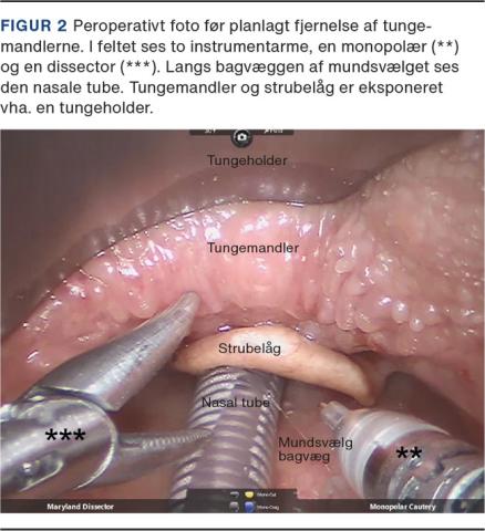 TORS blev introduceret til behandling af OSA i 2010 [26]. I Danmark blev det introduceret i 2017 og foretages nu på flere universitetsafdelinger som et supplement til anden søvnkirurgi. TORS er velegnet, når vejrtrækningspauserne skyldes hypertrofiske tungemandler og/eller tilbagefald af strubelåget, som ses hos op til 70% af patienterne med OSA [4]. I forhold til tidligere operationsteknikker rettet mod tungemandler og strubelåg giver TORS et godt overblik samt en mere tilgængelig instrumentering.