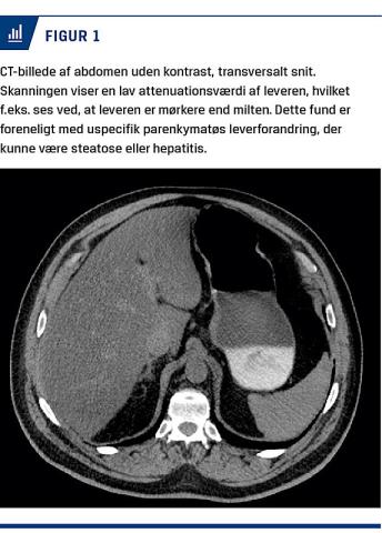 Under indlæggelse på intensiv og nefrologisk afdeling blev han fundet negativ for: Hantavirus, leptospirose, hepatitis A, B og C samt salicylat- og paracetamoloverdosering. Ligeledes blev han screenet negativ for antinukleære antistoffer, antineutrofile cytoplasmatiske antistoffer, mitokondrieantistof, glat muskulatur-antistof, glomerulær basalmembran-antistof, mitokondrie (E3-subunit)-immunglobulin G, M-komponent og aktin-AB. Undervejs blev der ved CT fundet pneumonisk udseende infiltrater i lungerne og uspecifikke parenkymatøse forandringer i leveren (Figur 1).