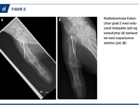 Ved radiologisk undersøgelse anbefales det såkaldte Bett’s view [7], hvor alle fire sider af trapezium bliver synlige (Figur 2), og de typiske forandringer med afsmalnet ledspalte, subluksation og osteofytter kan ses. Radiologisk anvendes Eaton-Littler (EL)-klassifikationen med graduering af artrosen i grad 1-4. Denne klassifikation er trods problemer med inter- og intraratersikkerhed stadig den mest anvendte [8]. Ved grad 1 er der kun breddeøget ledspalte som udtryk for væskeansamling og synovitis, ved grad 2 og 3 er der tiltagende forandringer i leddet, og ved grad 4 er der også degenerative forandringer i de tilstødende led. Hvis der er tvivl om, hvorvidt der er artroseforandringer i de tilstødende led, kan man supplere almindelig røntgenundersøgelse med CT og synliggøre artroseforandringerne [9].