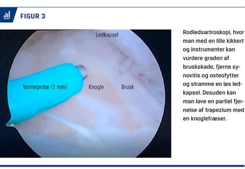 Artroskopisk synovektomi, fjernelse af ledmus og osteofytter samt kapselskrumpning med varmebehandling er teknisk mulig (Figur 3) og har måske en plads i behandlingen af EL grad 1 og 2, om end resultaterne kun er beskrevet i små serier, hvor der har været god effekt på selvrapporteret funktion, grebsstyrke og smerter [17, 18].