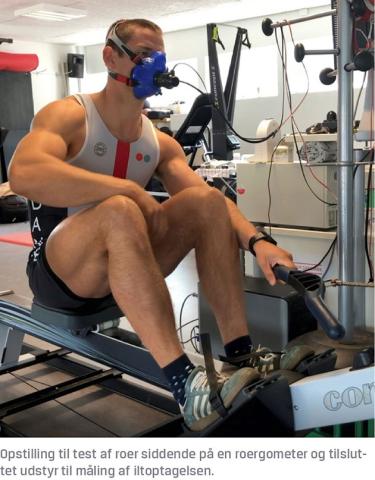 I hvile og under fysisk arbejde kan iltoptagelsen (VO2) kvantificeres noninvasivt. I hvile er VO2 0,2-0,25 l/min hos raske personer, mens en maksimal værdi for VO2 (VO2-max) angiver den øvre grænse for aerob energiomsætning. For en utrænet person er VO2-max 3-4 l/min afhængigt af bl.a. køn, størrelse og alder. Konditionstræning kan øge VO2-max [1], og i roning, hvor der anvendes en stor muskelmasse, er præstationsevnen relateret til VO2-max [2, 3]. VO2-max øges med træning, og der er rapporteret om en værdi på 6,0-6,5 l/min hos danske atleter [4], men der kan også ses højere værdier. Eliteatleter får regelmæssigt målt VO2 hos Team Danmark, som for nylig har registreret en VO2-max, der må anses for at være dansk rekord.