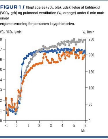 respiratoriske værdier fremgår af Figur 1. De højeste værdier beregnet som et gennemsnit over 30 s viste en VO2-max på 6,93 l/min sammenholdt med VCO2-max på 7,93 l/min. Beregnet over 5 s var VO2-max 7,04 l/min. Ventilationen var 210 l/min og blev opnået med 59 åndedrag/min og en ventilationsdybde på 3,6 l/åndedrag. Den respiratoriske kvotient var 1,18, og den højeste laktatværdi i kapillærblod var 22 mmol/l. Roerens totale blodvolumen blev målt til 10 l. Den 18. januar 2020 satte han ny dansk rekord i indendørsroning i tiden 5:44.3 min.