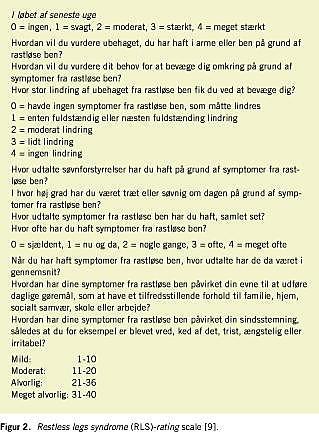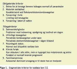 Syndromet rastløse ben er en hyppigt forekommende tilstand, der kendetegnes af et intenst og uimodståeligt behov for at bevæge underekstremiteterne. Patienterne har også sensoriske symptomer (paræstesier eller dysæstesier) og motorisk uro [1]. Symptomerne forværres i ro, lindres under bevægelse og optræder for det meste om aftenen eller om natten [1]. Det er vist, at ca. 94% af patienterne med rastløse ben lider af søvnproblemer, og at 80% har periodiske benbevægelser (periodic limb movement ) under søvn [2]. Rastløse ben eksisterer i en primær ofte autosomal dominant [3] form og i en sekundær form. Sidstnævnte er hyppigst beskrevet ved graviditet, dialyse, neuropati og jernmangelanæmi [4]. Patofysiologien er ukendt, men dopaminerge mekanismer spiller sandsynligvis en afgørende rolle [5].