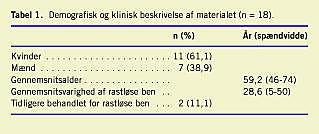 Materiale og metoder: Atten patienter med rastløse ben blev fulgt i gennemsnitlig 8,2 måneder i en åben prospektiv undersøgelse. Gennemsnitsdosis af ropinirol var 1,9 mg.
