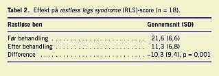Vores undersøgelse viser en klar forbedring af RLS-scoren un-der ropinirolbehandling, hvilket kan tyde på, at ropinirol kan være effektiv i behandlingen af rastløse ben. Vores resultater er i overensstemmelse med resultaterne af de få studier, som er blevet publiceret [10, 11]. I et åbent studie, som blev gennemført af 13 patienter, fandt man en positiv effekt af ropinirol på samtlige patienter og markeret effekt hos ti patienter [10]. I et senere åbent studie med ti patienter, hvor der blev udført polysomnografi, fandt man meget god effekt på otte patienter og god effekt på to [11]. Den gennemsnitlige dosis af ropinirol var 3,2 mg ±0,5 mg. I samme studie viste man en tydelig reduktion af natlige benbevægelser under søvn og forbedret søvnkvalitet. I et andet studie med polysomnografi, hvor akuteffekten af ropinirol blev undersøgt, fandt man positiv effekt af ropinirol på både søvn og periodiske benbevægelser under søvn [12, 13].