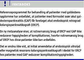 Der er inden for de seneste par år blevet publiceret to nye undersøgelser [4, 5], i hvilke man endnu en gang forsøger at besvare spørgsmålet: »Skal der udføres tidlig ERCP hos alle patienter med GAP?«, idet der nu er lavet en metaanalyse af de i alt fem randomiserede undersøgelser om emnet [6]. Konklusionen på metaanalysen er, at tidlig ERCP ikke mindsker risikoen for komplikationer hverken totalt (relativ risiko (RR): 0,94; (95% konfidensinterval (KI): 0,63-1,40)), eller hvis der stratificeres for mild (RR: 0,79; 95% KI: 0,26-2,47) eller svær pankreatitis (RR: 0,77; 95% KI: 0,30-1,98). Selv om der er visse begrænsninger i metaanalysen, idet de fem studier er meget heterogene i deres definitioner af tidlig ERCP og sværhedsgraden af pankreatitis, må man dog konkludere, at rutinemæssig anvendelse af tidlig ERCP til patienter med GAP ikke mindsker patienternes morbiditet eller mortalitet.