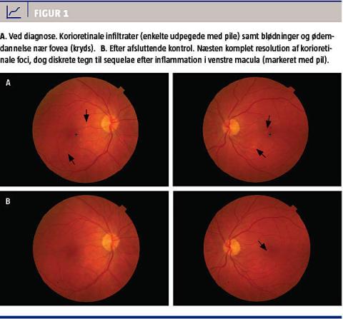 På grund af de okulære fund blev behandlingen med fluconazol forlænget, og patienten blev efter udskrivelsen fulgt tæt i oftalmologisk ambulatorium. Efter fire måneder var der næsten komplet resolution af de okulære forandringer og forbedret synsstyrke (Figur 1B), hvorefter den antimykotiske terapi kunne seponeres og behandlingen afsluttes.