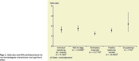 Et råd fra lægen om at slutte med at ryge giver en øget chance for rygestop [2] (Figur 1 ), med en absolut effekt i gennemsnittet på 2,5% målt efter 6-12 måneder. Omkring 90% af studierne var udført i almen praksis. Der var evidens for, at flere opfølgende konsultationer giver bedre resultater end blot en enkelt konsultation. De amerikanske Clinical Practice Guidelines angiver, at både konsultationens længde, den akkumulerede kontakttid og antallet af opfølgninger viser dosisrespons i sammenhæng med ophørsraten [3].