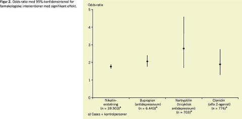 Bupropion og nortryptilin fordobler chancerne for at klare at holde op med at ryge [9] (Figur 2). Effekten er uafhængig af, om personen har depression eller ikke. Effekten af bupropion var uafhængig af, om der var tale om frivillig rekruttering eller om rekruttering gennem sundhedsvæsenet. Der er rapporteret en del bivirkninger i forbindelse med de antidepressive rygestopmidler (f.eks. øget forekomst af kramper ved bupropion). Det betyder, at de ikke er førstevalgspræparater [3, 9]. De øvrige antidepressiva har ikke vist effekt på rygestop.