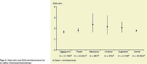 I Cochranemetaanalysen, hvor næsten 40.000 patienter indgår, finder man klar effekt af alle nikotinpræparater (NRT): tyggegummi, inhalator, næsespray, sublingvale tabletter og plaster [8]. De er alle nogenlunde lige effektive inklusive plastertyperne af forskellig varighed, og de giver omkring en fordobling af chancen for rygestop efter 6-12 måneder (Figur 2 og Figur 3 ). Der er ikke forskel på, om man bruger nikotintyggegummi til bestemte tidspunkter eller ved behov.