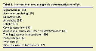 Denne oversigtsartikel bygger i al væsentlighed på systematiske review og metaanalyser af randomiserede undersøgelser, hvilket betyder, at de fremførte udsagn hviler på et solidt evidensbaseret grundlag. Resultater fra flere undersøgelser er samlet, således at talmaterialet bliver omfattende, og resultaterne kan for flere interventioners vedkommende præsenteres med relativt snævre sikkerhedsgrænser. De mere sparsomt undersøgte interventioner kan i artiklen sammenlignes med de velundersøgte. Udvælgelseskriterierne i Cochraneanalyserne er velbeskrevne, og resultaterne er klart præsenterede, ligesom der er rimelig sikkerhed for, at resultater fra de væ-sentlige undersøgelser på området er kommet med.