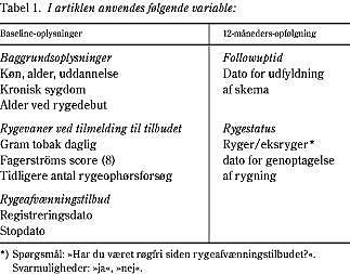 Alle deltagere udfyldte i forbindelse med indgang til tilbuddet et registreringsskema om rygevaner og enkelte baggrundsoplysninger. Oplysningerne skulle anvendes i forbindelse med tilrettelæggelse af det individuelle rygeafvænningsforløb og i forbindelse med evaluering af tilbuddet. Deltagerne blev i denne forbindelse ligeledes bedt om tilladelse til indhentning af oplysninger om rygestatus 12 måneder efter tilmelding til tilbuddet (Tabel 1 ).