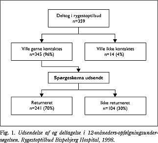 Over et halvt år (19. oktober 1998 til 31. marts 1999) deltog i alt 359 personer i rygeafvænningstilbuddet. Alle fik tilsendt et spørgeskema med posten 12 måneder efter datoen for tilmelding, bortset fra 14 ansatte, som havde angivet, at de ikke ønskede at indgå i opfølgningsundersøgelsen (Fig. 1 ).