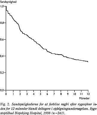 I Fig. 2 vises sandsynlighederne for at forblive røgfri efter rygeophør for de ansatte, som tog imod rygeafvænningstilbuddet og deltog i 12-måneders-opfølgningen. Tolv blandt disse gjorde dog aldrig et forsøg, hvilket afspejles i, at kurven starter med et lodret fald. Efter fem måneder er sandsynligheden for stadig at være røgfri 50%, og efter et år er sandsynligheden 33%.