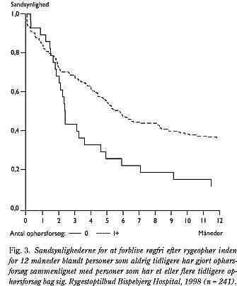 I Fig. 3 ses en tendens til, at personer, som tidligere har gjort ophørsforsøg, har større chance for at forblive røgfri 12 måneder efter rygeophør end personer, som ikke tidligere har forsøgt at stoppe (p = 0,11, Tabel 3 ).